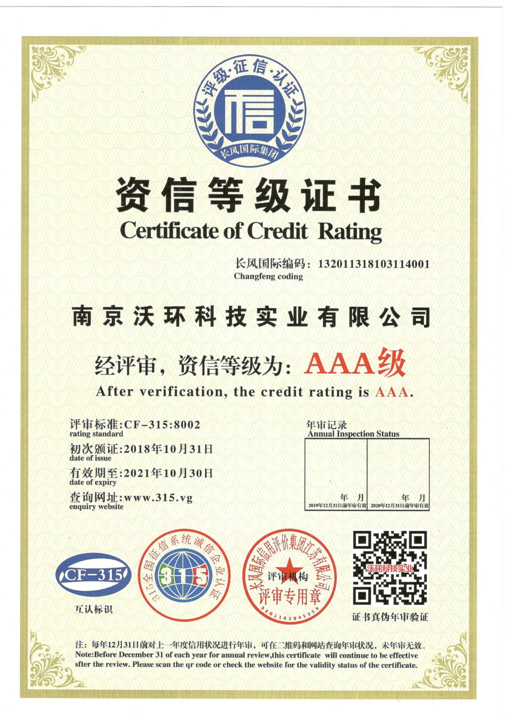 熱烈祝賀南京沃環(huán)公司被專業(yè)評(píng)審機(jī)構(gòu)-長風(fēng)國際集團(tuán)評(píng)為AAA級(jí)資信等級(jí)
